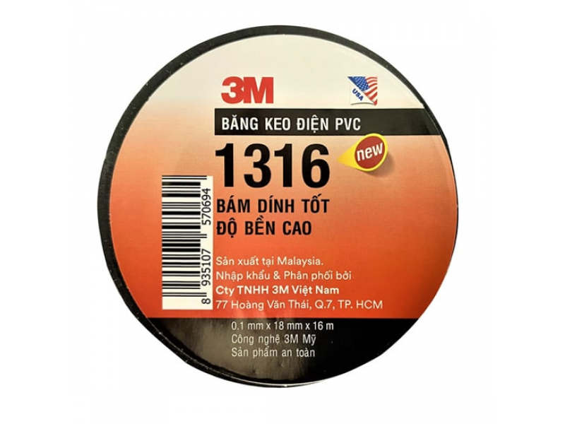 - Băng keo điện 3M PVC 1316 là dòng băng keo cách điện hạ thế lên tới 600V, đảm bảo độ dính, đàn hồi, co giãn tốt.