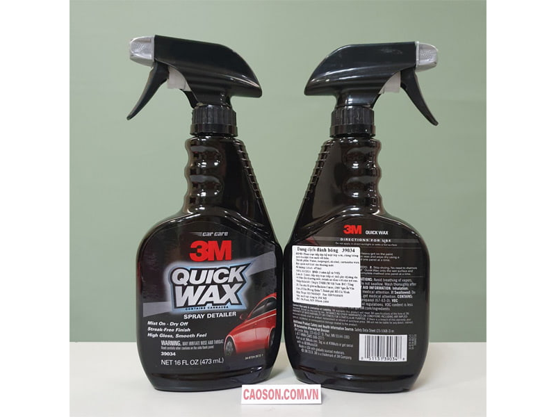 - Với thành phần sáp đặc biệt Carnauba Wax trong chai xịt 3M Quick Wax 39034, bạn có thể nhanh chóng mang lại dáng vẻ sáng bóng như mới chỉ trong vài phút. Dù trên bề mặt khô hay ướt, bạn vẫn có thể dễ dàng làm sạch các vết ố, mờ và tạo ra độ bóng cao, không để lại vệt ố nước sau khi lau.