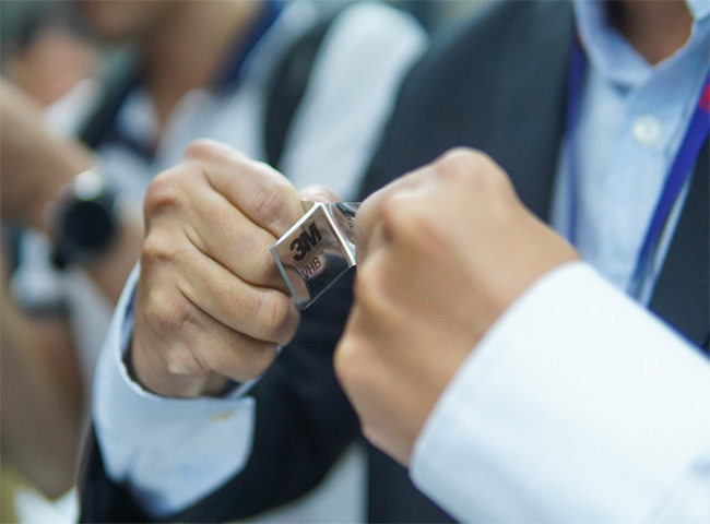 - Tại khu trưng bày, hàng loạt thiết bị điện tử như điện thoại, máy tính bảng, đồng hồ, kính thực tế ảo, sử dụng keo 3M để kết dính các bộ phận cũng được trưng bày. Hãng băng keo Mỹ cho biết họ có hơn 2.000 mẫu keo và băng dính phục vụ cho nhu cầu đa dạng trong ngành điện tử. Ví dụ các thiết bị có thể cần băng keo với độ mỏng, độ kết dính, khả năng chống nước khác nhau.